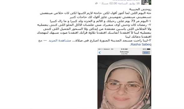 "زوجتى الحبيبة.. اليوم مر 73 يومًا على رحيلك و الألم و الحزن ولد كبيرًا و ما زال كبيرًا، رمضان كان وحش أوى من غيرك مش علشان الأكل الحلو اللي كنتي بتعمليه ولا الجلاش اللي ياسين مفتقده من يديكي ولا السحور الجميل اللي كنتي بتعمليه لينا، افتقدنا أنفاسك افتقدنا تلاوة قرآنك افتقدنا صوت منبهك لتهجدك افتقدنا دعائك لينا".