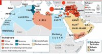ووضعت - حسب الخريطة - موريتانيا ومصر والسودان والجزائر والمغرب في خانة "الديموقراطيات المزيفة"، أما اليمن وليبيا فظهرا كدولتين فاشلتين.