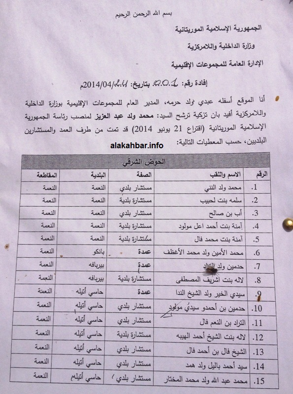 زكى 62 من عمدة البلديات في موريتانيا إضافة لعشرات المستشارين في مختلف الولايات الموريتانية، وذلك حسب وثيقة التزكية التي اعتمدها المجلس الدستوري، بعد أن أصدرتها الإدارة العامة للمجموعات الإقليمية بوزارة الداخلية واللامركزية في موريتانيا، وتم توقيعها من طرف مديرها يوم 24 إبريل 2014.