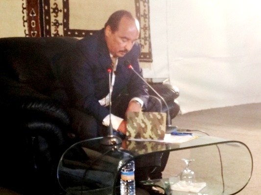 جلس الرئيس محمد ولد عبد العزيز وسط ستة عشر صحافياً، ثمانية عن يمينه وثمانية عن شماله، في باحة دار الضيافة تحت خيمة صناعية من البلاستيك لم تكن لترد برد نواذيبو التي تنام ودرجة الحرارة لا تتجاوز 15 درجة، مع نسبة رطوبة مرتفعة، وديكور كلاسيكي اعتمد على الصناعة المحلية.