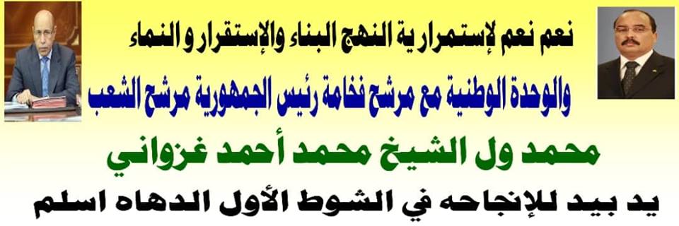 قرر أطر ووجهاء أترارزه تنظيم نشاط مشترك دعما للمرشح محمد ولد الغزوانى، بعد دعوة أقامها الأمين العام لوزارة المياه ورئيس رابطة عمد أترارزه محمد ولد احمدوا.
