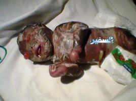 وتظهر الصور غرابة شكل الطفل حيث أنه يتوفر على اسنان ومبتور اليدين والرجلين وبلا عيون بالإضافة الى أنه يحمل عضوين جنسيين لذكر وانثى حرصنا على عدم اظهارهما للمشاهد الكريم.