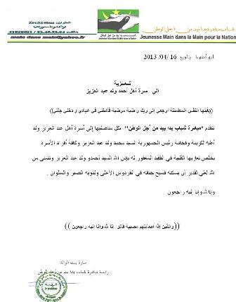 أعربت سارة بنت الوالد رئيسة مبادرة يدا بيد عن تعازيها الحارة لأسرة أهل عبد العزيز في وفاة المغفور له انشاء الله أحمدو ولد عبد العزيز..