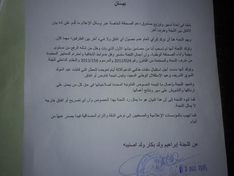 أصدرت لجنة دعم الصحافة الموريتانية الخاصة مساء اليوم الثلاثاء بيانا فندت فيه بيان الهيبة ولد الشيخ سيداتي مدير موقع الأخبار التابع لحزب تواصل، والذي تناقلته عنه بعض المواقع والذي ادعى فيه حصول اتفاق بينه صحبة من يسميهم "المؤسسات الجادة" مع لجنة دعم الصحافة.