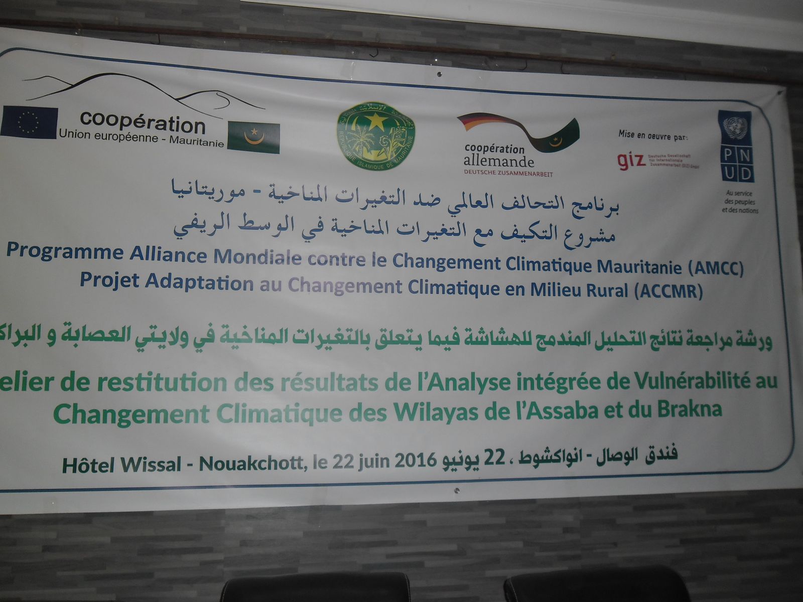 بدأت اليوم الاربعاء في نواكشوط،أعمال ورشة مراجعة نتائج التحليل الممنهج للهشاشة فى مايتعلق با لتغييرات المناخية فى ولايتى العصابة والبراكنة وتنظم هذه الورشة من طرف وزارة البيئة والتنمية المستدامة بالتعاون مع برنامج الامم المتحدة للتنمية والاتحاد الاوروبي والوكالة الالمانية للتعاون الفني فى اطار برنامج التحالف العالمي ضد التغيرالمناخي ومشروع التكيف مع التغير المناخي في المناطق الريفية بموريتانيا.
