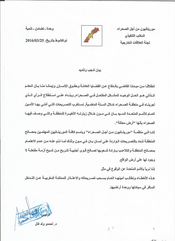 "موريتانيون من أجل الصحراء" توزع اليوم في العاصمة الموريتانية نواكشوط بيانا حصل موقع الإشعاع على نسخة منه تستغرب فيه وتندد بتصريحات الأمين العام للأمم المتحدة بان كي مون خلال زيارته الأخيرة لمخيمات اللاجئين الصحراويين بتيندوف, مطالبة الأمين العام بسحب تصريحاته والاعتذار للملكة المغربية عن التصريحات التي تمس سيادتها ووحدة أراضيها.