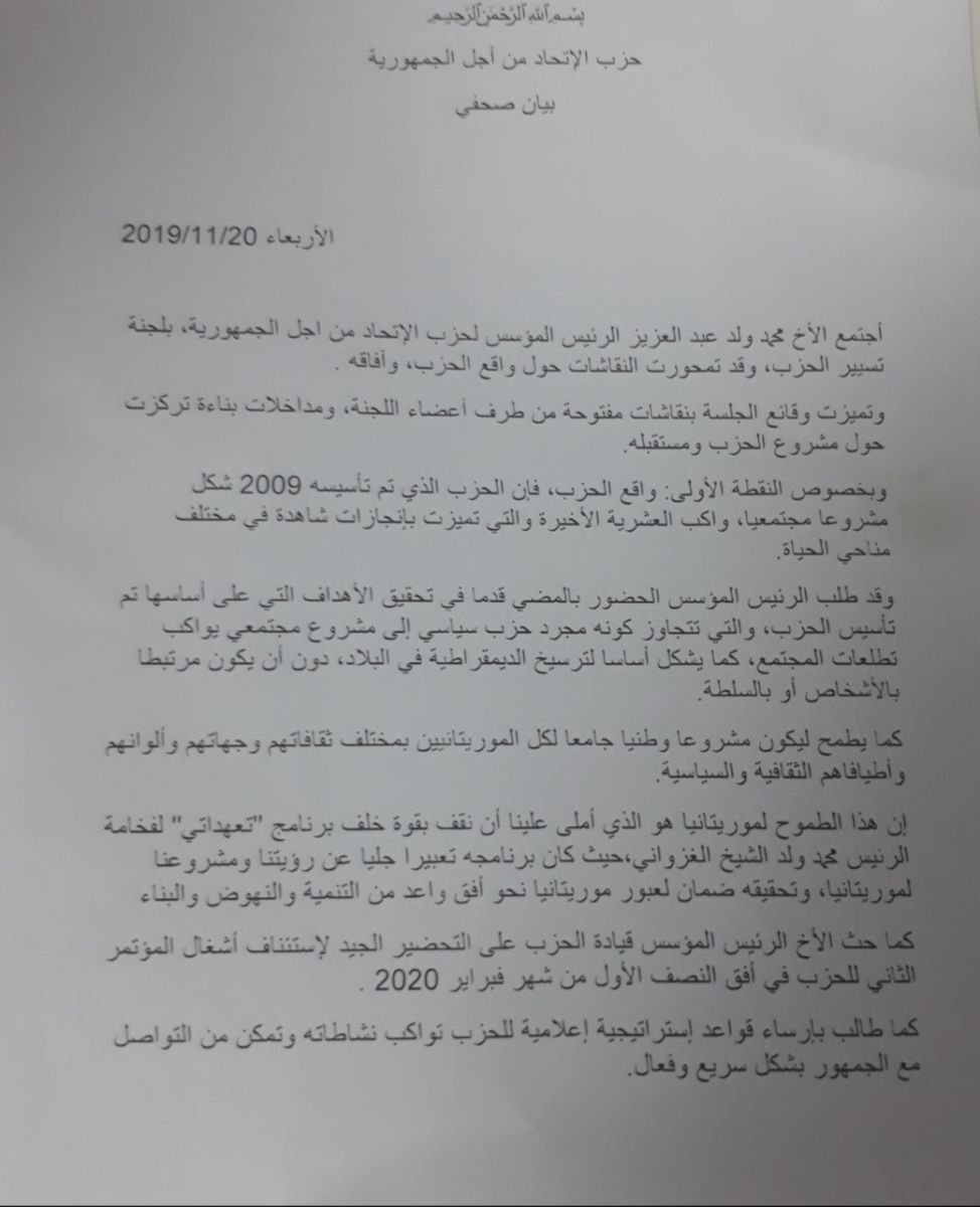 اِقرأ المزيد: الحزب الحاكم يصدر بيانا صحفيا ..وهذا ماقاله ولد عبد العزيز في الاجتماع