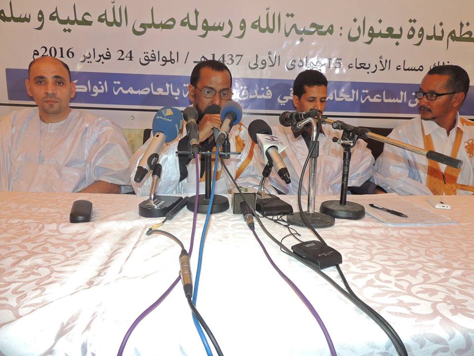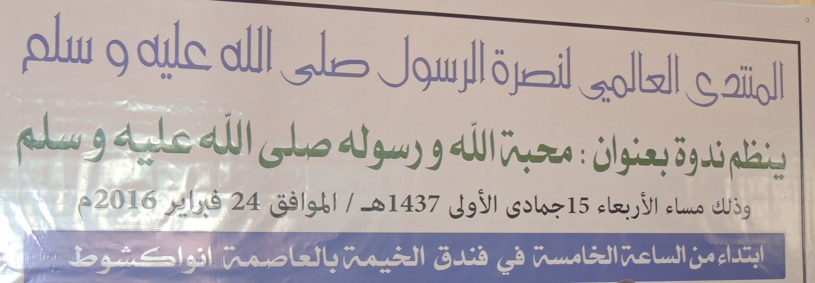 نظم المنتدى العالمي لنصرة رسول الله صلى الله عليه وسلم الذي يرأسه الشريف الإمام الشيخ علي الرضى بن محمد ناج الصعيدي، ندوة تحت عنوان "محبة الله ورسوله صلى الله عليه وسلم” وقد نُظمت هذه الندوة في فندق الخيمة بالعاصمة انواكشوط وذلك مساء الأربعاء 15 جمادى الأولى من سنة 1437 للهجرة الكريمة، موافق: 24 / 02 / 2016. بدأت الندوة في الساعة الخامسة مساء، وكانت محاورها كما يلي: أولا: نظمت ختمة للقرآن الكريم، وزعت على نحو ستين قارئا. بعدها تلا القارئ الشاب علي الرضى بن المختار بن سيد المختار فواتح سورة النجم. ثم تلا ذلك كلمة رئيس المنتدى العالمي لنصرة رسول الله صلى الله عليه وسلم، الشيخ علي الرضا بن محمد ناج، وقد ألقاها بالنيابة عنه الأمين العام للمنتدى السيد محمد محمود ابن بدي. وقد رحب في كلمته بكافة الحضور وبعد الترحيب بدأ الأمين العام في قراءة الكتاب المعروف بكتاب "الحراسة" الذي يقول فيه الشيخ بعد التقديم: أما بعد فإني قد استخرت الله عز وجل واستعنت به في جمع كلمات وجيزة، تبين وجوب حراسة الإيمان والإسلام والإحسان من التبديل والتغيير والزيادة والنقصان، إلى أن يقول فيه: آن الأوان أن نخرج بإذن الله من بحر الهوى والظلمة والطغيان، وأن نعود إلى المحجة البيضاء التي هي بر الأمان، إلى أن يقول: أحبابي في الله آن الأوان أن ننصر رسول الله صلى الله عليه وسلم نصرة شاملة عامة بعون الله وفضله وقدرته؛ فأول نصرة رسول الله صلى الله عليه وسلم الإيمان بأنه رسول من عند الله عز وجل، والإيمان بكل ما جاء به من عند الله عز وجل، ومن نصرة رسول الله صلى الله عليه وسلم الدعوة إلى الدين الذي جاء به من عند الله جميعا، وتعلم أحكام الله تعالى وبذل الوسع في التعلم والتعليم، والأمر بالمعروف والنهي عن المنكر إلى آخر الكلمة. ثم بعد كلمة رئيس المنتدى والتي ألقاها الأمين العام للمنتدى، أفسح المجال لمجموعة من المتدخلين بالنصوص النثرية والشعرية حيث تعاقبوا كلهم على منبر النصرة والمحبة لله ولرسوله صلى الله عليه وسلم، منشدين الكلمات النثرية الرائعة والقصائد الرنانة بالفصيح والشعبي في المحبة والنصرة لله ولرسوله صلى الله عليه وسلم بالمديح للنبي والدفاع عن جنابه الشريف وعن الشريعة الغراء. وقد أجادوا في مداخلاتهم وأفادوا، واهتزت القاعة بالتنويه بقصائدهم وكلماتهم الرائعة. وكان أصحاب الكلمات النثرية والشعراء المجيدين كالتالي: السيد الشريف العلامة أحمدُ بن عابدين المدرس بمحظرة الشرفاء في بلدة التيسير في الضاحية الشمالية للعاصمة، وقد ألقى كلمة في السيرة النبوية بعنوان إرهاصات مولده الشريف، وبعده تدخل الشاعر الاديب مدى الدين بن أشبيه بن أبوه حيث ألقى قصيدة رائعة في المديح النبوي الشريف مع مدح الخلفاء الراشدين والترضي عنهم وترتيبهم في الفضل على ترتيبهم في الخلافة كما هو مذهب أهل السنة تلاه الشابان الشبلان وهما: الولد محمد صالح بن محي الدين بن أحمد سالك بن أبوه، حيث قدم نصا في المديح النبوي، ثم الولد الشريف الصعيدي محمد ناج بن الحسن بن عابدين، وقرأ هو الآخر نصا من ديوان الشيخ علي الرضى بن محمد ناج، ثم تلاهما الشيخ العلامة المحب المادح الناصر لرسول الله صلى الله عليه وسلم، السيد محمد يحي بن المنجى، حيث قرأ نصوصا في المديح النبوي، تلا ذلك العلامة المفتي في مدينة انواذيبو والمدرس فيه بحظرة محمد مولود بن أحمد فال، الشيخ محمد بن محمد عبد الرحمن بن محمد مسعود، حيث تكلم على نبذة من محارم اللسان، تلا ذلك الشاعر الأديب السيد محمذن كرْ بن سيد محمد حيث قدم نصا بالشعر الحساني في المديح النبوي، تلاه الشريف المؤلف العالم المستشار لرئيس المنتدى العالمي، السيد سيد محمد بن باباه ابن بدي، حيث قرأ من كتابه الظفر بمعجزات سيد البشر، وقد قرأ منه ما يتعلق بمعجزة الإسراء والمعراج، بعده تدخل السيد الشاعر الناثر الأديب السيد محمد الحي بن الإمام بن الشريف، حيث تدخل حول مظاهر التكريم للرسول الكريم في القرآن الكريم، ثم بعده تدخل أستاذ العلم والأ