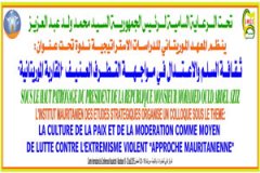 ينظم المعهد الموريتاني للدراسات الإستراتيجية، بأمر من الحكومة الموريتانية وبالتعاون مع وزارة الشؤون الخارجية و التعاون، ندوة دولية تحت عنوان:"ثقافة السلم و الاعتدال في مواجهة التطرف العنيف: المقاربة الموريتانية" يومي الأربعاء و الخميس 19 و 20 أغسطس 2015.