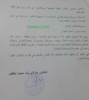 وجهت السلطات المورتانية امس الثلاثاء، رسالة إلى أغلب الاحزاب السياسية في البلاد تدعوها للمشاركة في حوار سياسي مرتقب يوم السابع من الشهر المقبل.